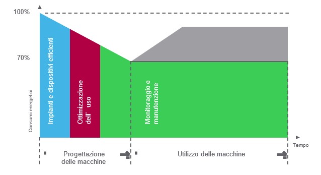 Figura 5 Il contenimento dei consumi energetici si protrae nel tempo grazie al monitoraggio e controllo durante il ciclo di vita delle macchine. (Schneider Electric Industries)