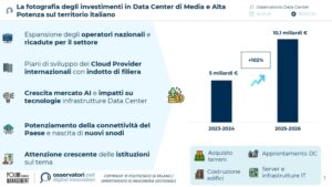 Il 2024 ha confermato la crescita del settore Data Center in Italia, con un aumento del +17% rispetto all’anno precedente e una potenza complessiva di 513 MW IT. Secondo l’Osservatorio Data Center del Politecnico di Milano, il settore ha raggiunto un ruolo chiave nell’economia digitale del Paese, con investimenti per 5 miliardi di euro nel biennio 2023-2024 e ulteriori 10,1 miliardi previsti entro il 2026. Il trend sembra destinato a proseguire, con nuove aperture già annunciate oltre questa finestra temporale.