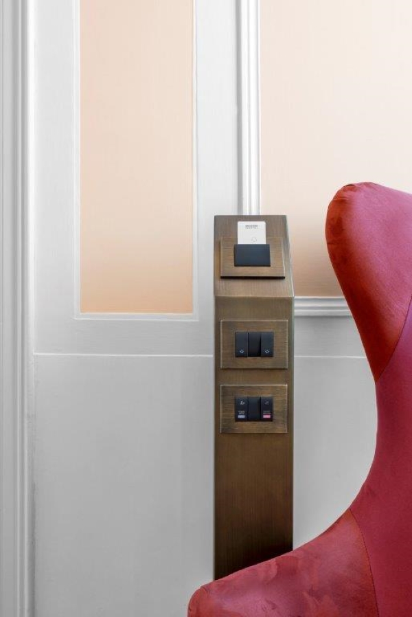 La contemporaneità accanto all’estrema cura del passato emerge anche nella scelta della serie Eikon Exé, nella sua declinazione di comando tradizionale. I dispositivi installati sono perfettamente visibili e disposti in forma ordinata in ogni area dell’hotel: sulle eleganti testate del letto in tessuto imbottito, sulle boiserie dei bagni, e in tutti gli spazi comuni. Eikon Exé, appare una scelta quasi obbligata: una geometria classica e definita, perfettamente in linea con lo stile della struttura.